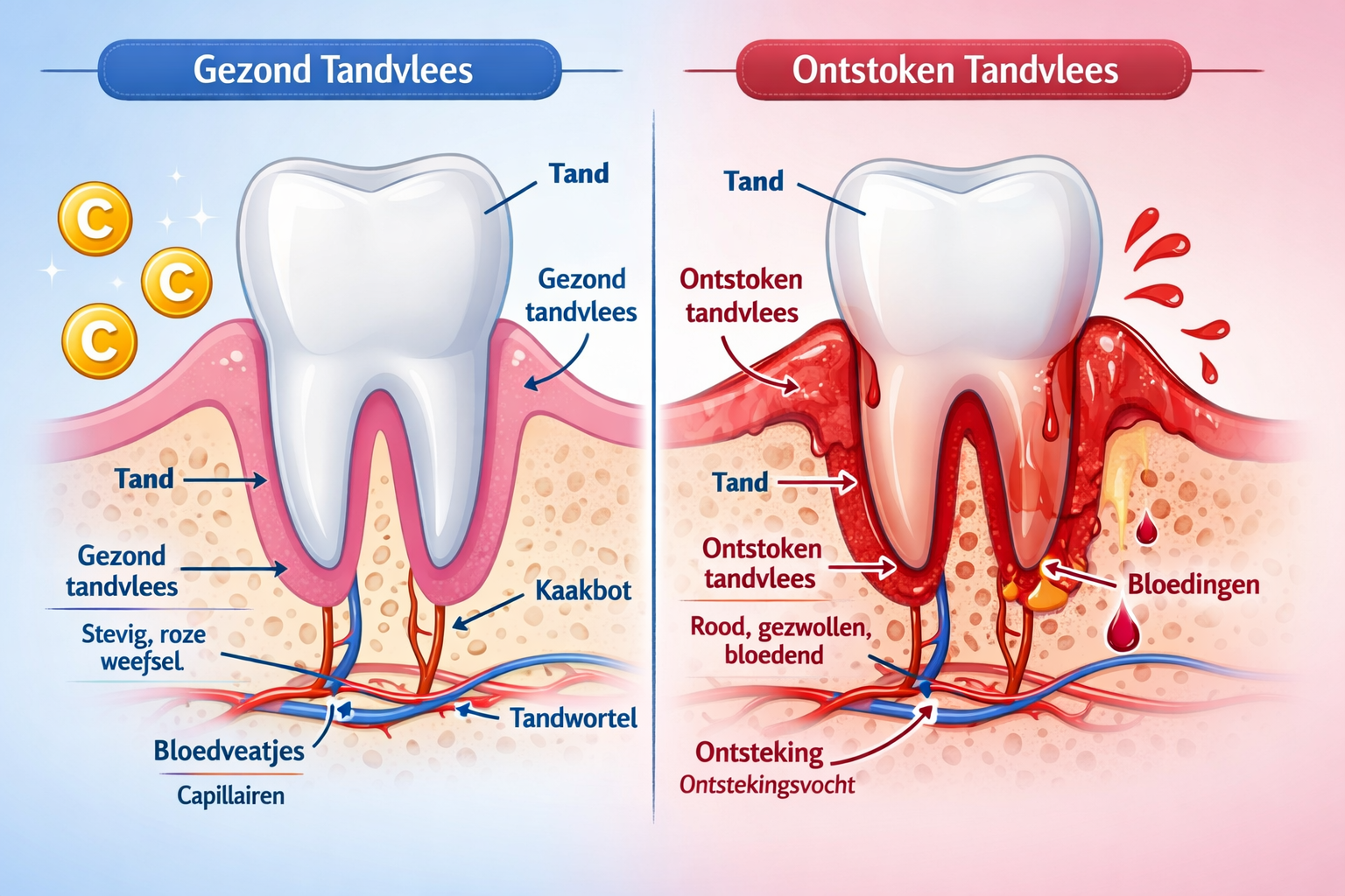 Vitamine C is onmisbaar voor de aanmaak van collageen, het eiwit dat de structuur vormt van je tandvlees, bloedvaten en bindweefsel. Zonder voldoende vitamine C kan je lichaam geen sterk collageen aanmaken, waardoor je tandvlees zwak en kwetsbaar wordt.