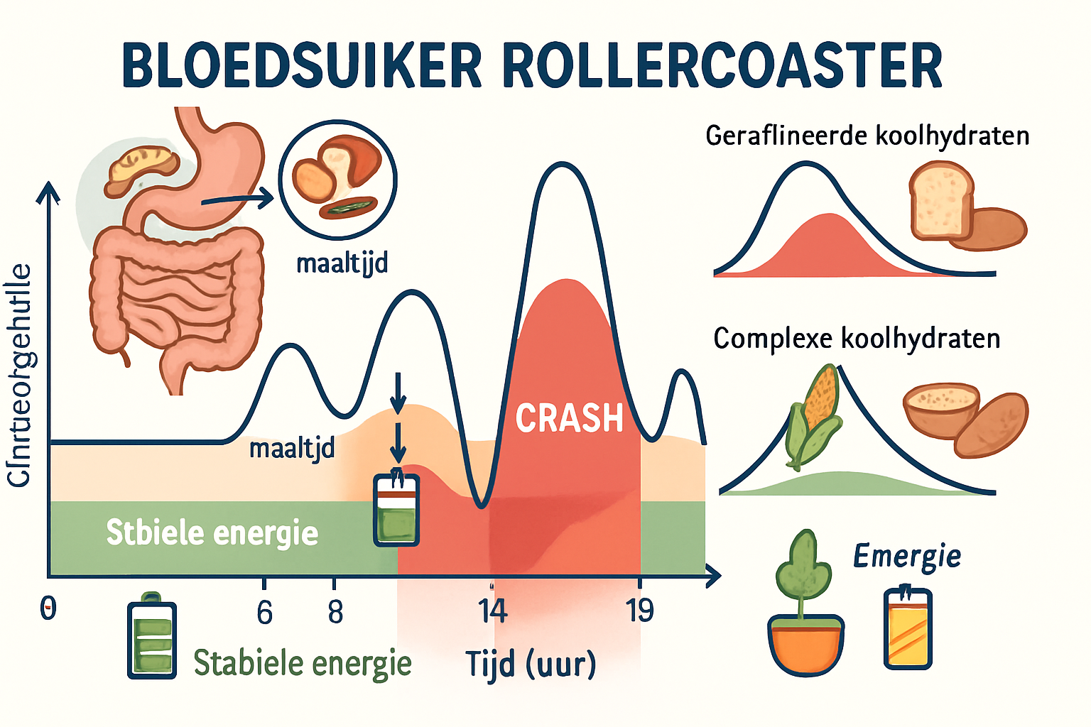 Dit leidt tot een bloedsuikerachtbaan: eerst een snelle stijging, gevolgd door een even snelle daling. Deze daling veroorzaakt: