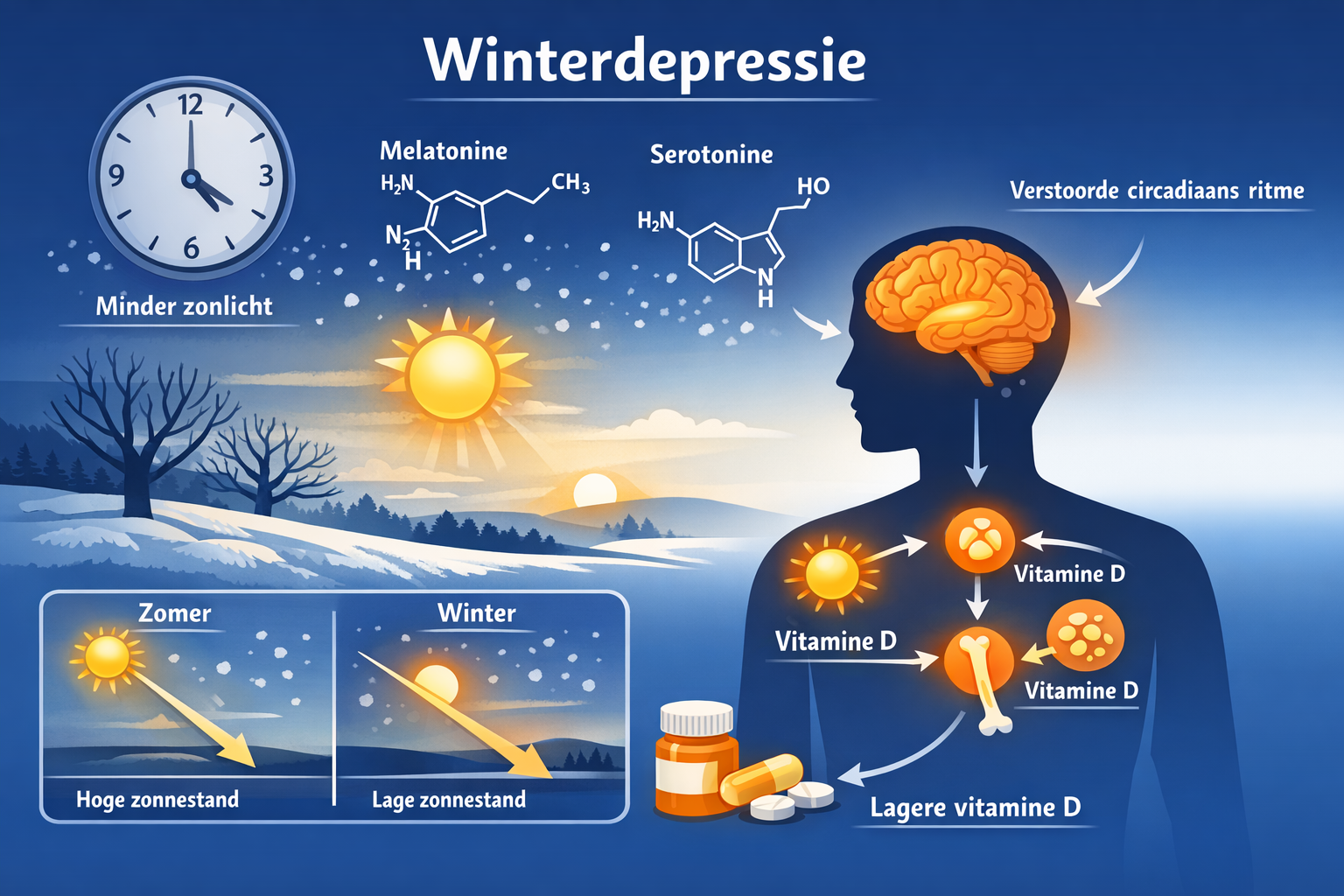 - Winterdepressie wordt veroorzaakt door een gebrek aan zonlicht, wat leidt tot verstoorde serotonine- en melatonineproductie
