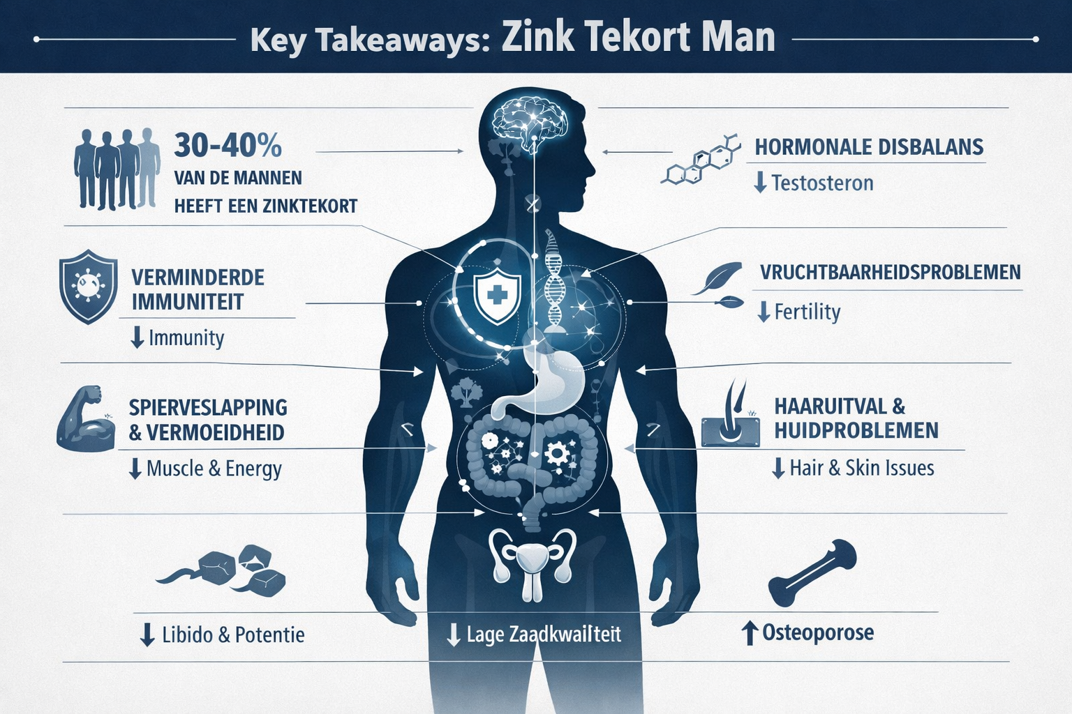 De symptomen van zinktekort, chronische vermoeidheid, verminderde weerstand, haaruitval, verminderde libido, zijn herkenbaar voor veel mannen, maar worden vaak ten onrechte toegeschreven aan stress of ouderdom.